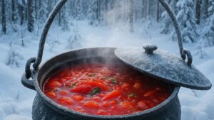 Для додаткового аромату роблю легку засмажку з моркви й цибулі, обсмажених на олії до золотистості. Додаю її в казан, коли капусняк уже починає густіти. З кожною хвилиною він стає все наваристішим, а запах над вогнищем просто неймовірний. Наприкінці додаю лавровий лист, чорний перець, трохи паприки та зелень — все, що потрібно для повного смакового завершення.