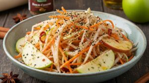 Шукаєте ідею для швидкого, корисного та неймовірно смачного гарніру? Сьогодні ми готуємо справжній вітамінний мікс — салат із дайкона, моркви та яблука з особливою пікантною заправкою! Ця страва поєднує в собі свіжість овочів, кислинку яблука та вибуховий аромат спецій.