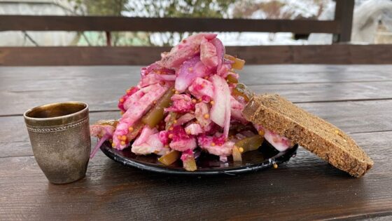 Наступного дня нарізаю оселедець рулетом на акуратні скибочки. Подаю їх на шматочках чорного хліба – це класика, яка ніколи не підводить. А щоб подача була по-справжньому українською та ситною, доповнюю страву картоплею в кожушках і квашеною капустою.