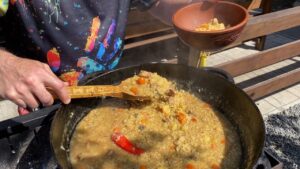 Далі в казан відправляю **дрібно нарізану цибулю та моркву**, щоб додати юшці солодкості та правильної текстури. Коли овочі трохи розм’якшуються, додаю **картоплю**, яку нарізаю крупнішими шматочками — вона робить страву ситною та домашньою.